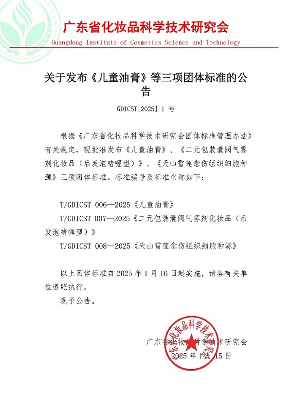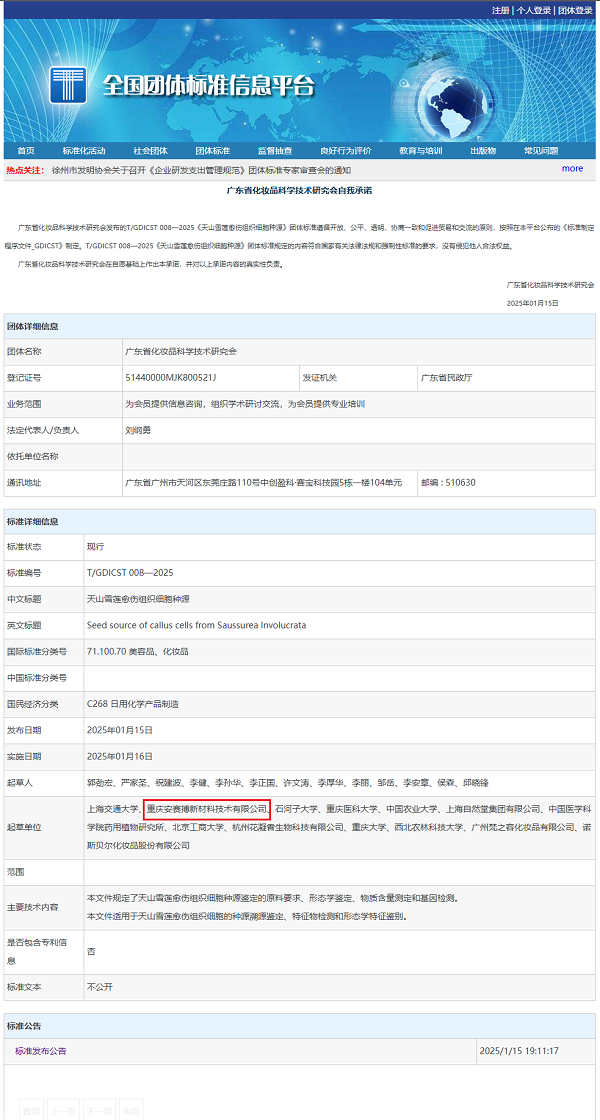 1月15日,广东省化妆品科学技术研究会正式发布了T/GDICST 008-2025《天山雪莲愈伤组织细胞种源》团体标准。安赛搏作为该标准的主要起草单位之一,深度参与了标准的编制工作,并凭借强大的技术实力和丰富的行业经验,为标准的形成提供了有力支持。