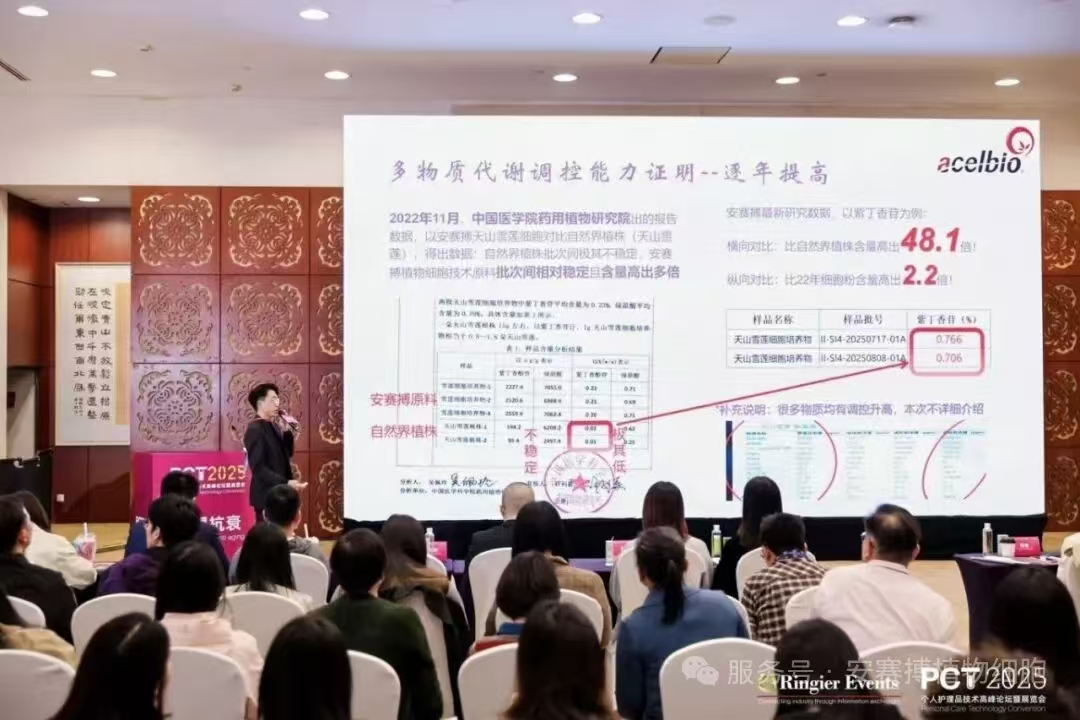 11月19-20日,以「科技赋能美」为主题的2025个人护理品技术高峰论坛(PCT)在广州白云国际会议中心盛大举办。安赛搏新材料技术有限公司携天山雪莲细胞培养物新原料及植物细胞来源的外泌体产品深度参与此次行业盛会。