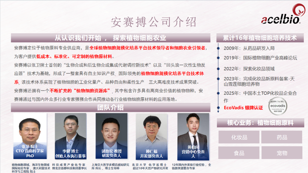 目前,安赛搏已与多家知名化妆品企业达成合作,并获得EcoVadis银牌认证。公司产品体系涵盖化妆品、药品、食品、宠物等多个领域,为客户提供低成本、标准化、可定制的植物原材料解决方案。