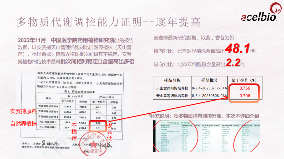 安赛搏通过以张卫院士首创的“生物合成和后生物合成集成代谢调控新技术”实现了同一植物开发出不同功效方向的细胞线,如具有抗衰功效的紫色款天山雪莲。天山雪莲本身是白色花朵,我们通过代谢调控技术把它的花色苷提到一定的程度,所以它细胞呈现紫色,这是紫色款天山雪莲原料的来源,其紫丁香苷的成分比自然界天山雪莲高48.1倍!