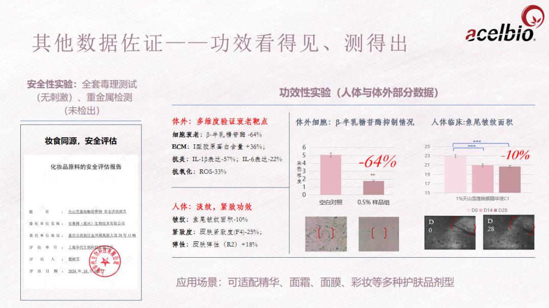 安赛搏的天山雪莲原料经过严格功效验证,体外和人体测试数据均表现出色: