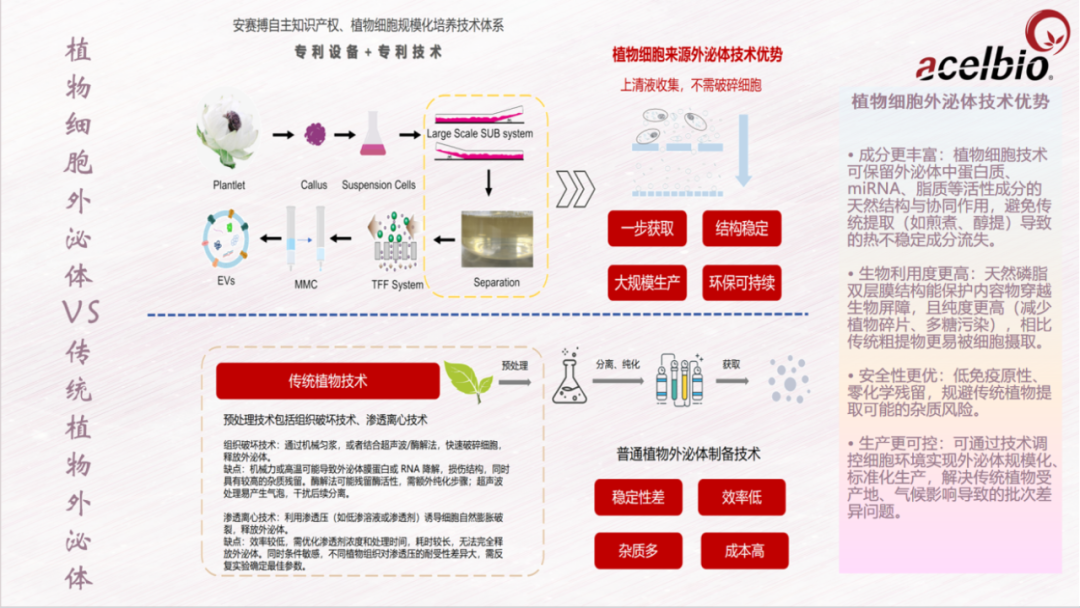 作为化妆品原料,植物外泌体在安全性、成分功效、渗透吸收等方面优势显著,还能解决传统原料的诸多痛点,适配当下护肤市场需求。安赛搏植物细胞外泌体在技术上相比传统植物外泌体原料具有显著优势: